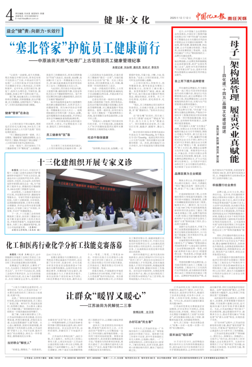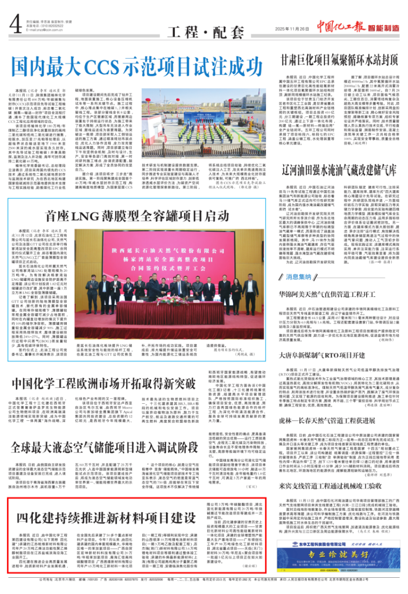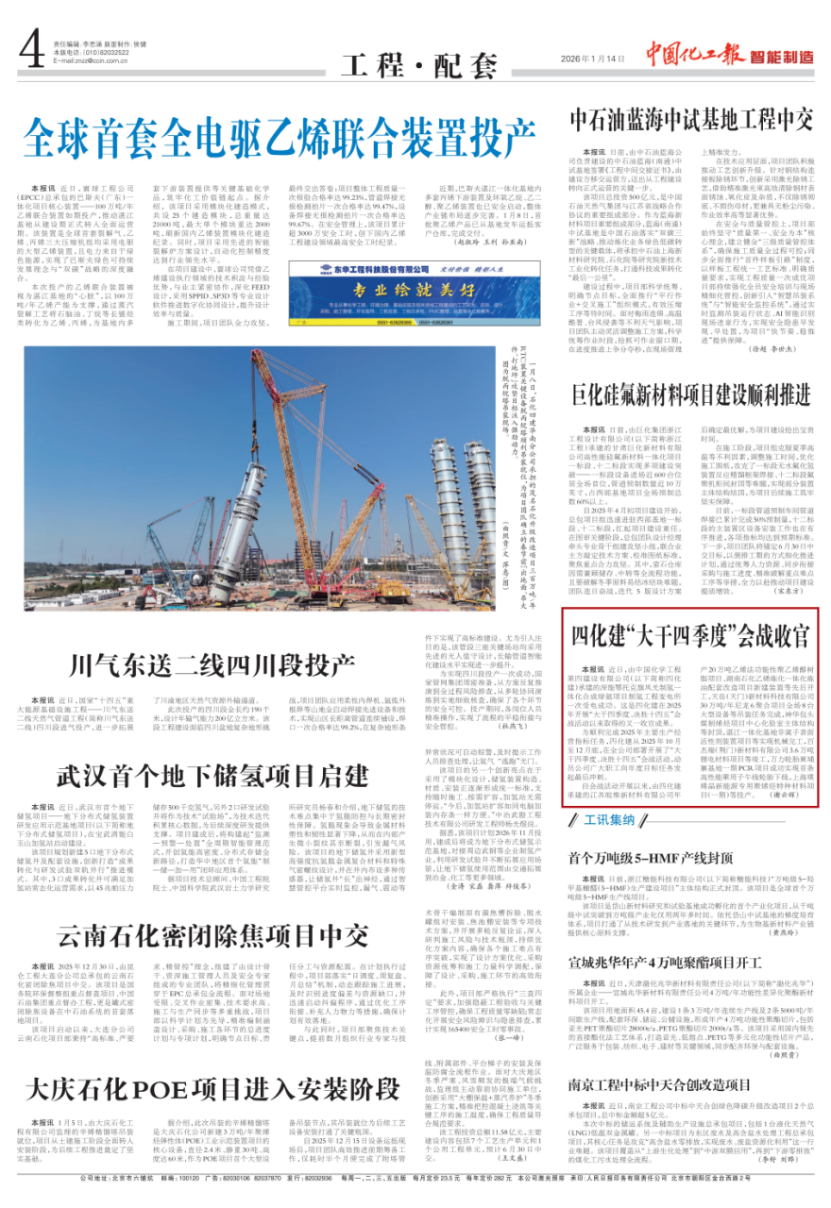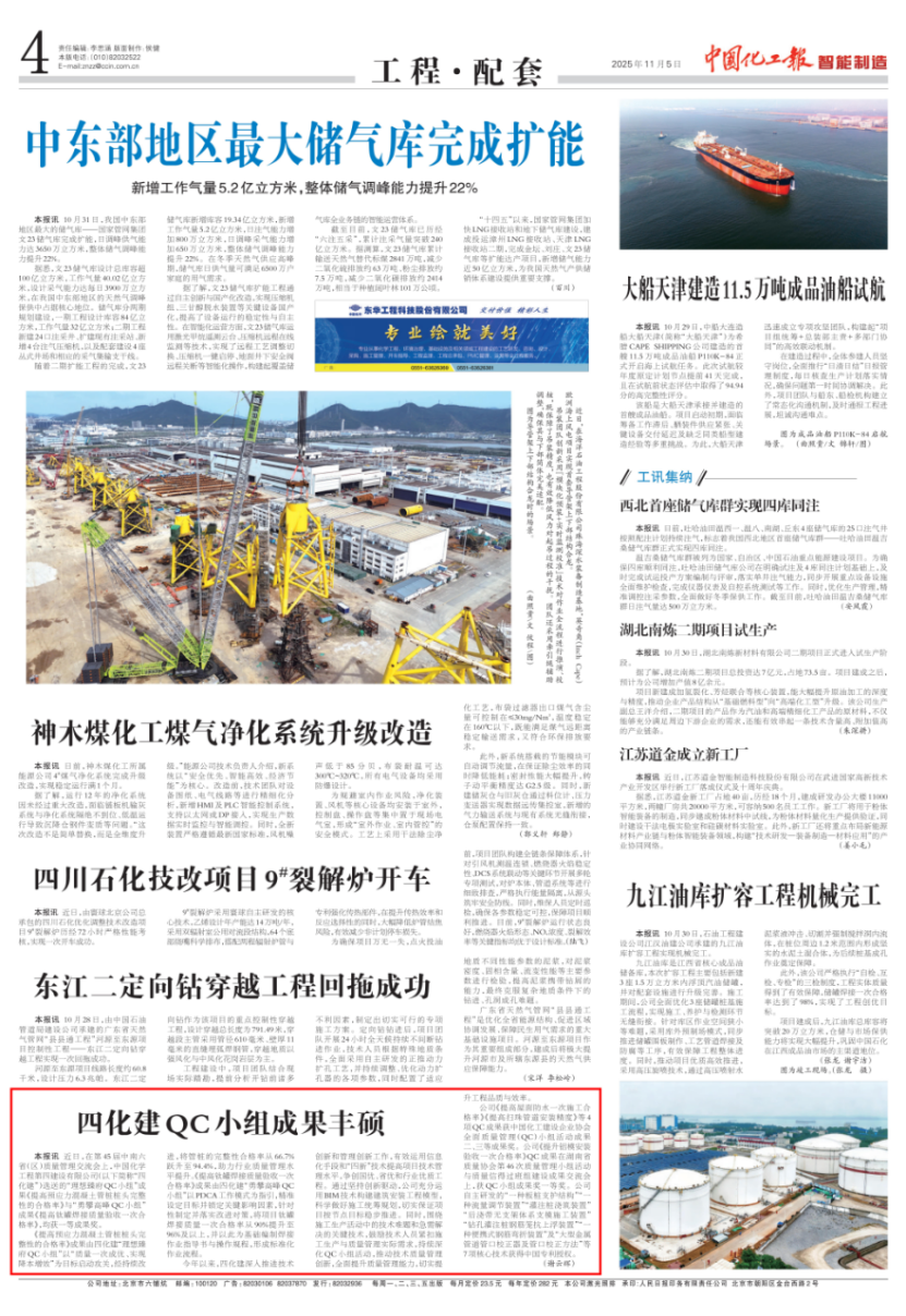 近日,中國石油和化學(xué)工業(yè)權(quán)威報紙、中國百強(qiáng)報刊——《中國化工報》連續(xù)刊發(fā)多篇報道,聚焦中國化學(xué)工程第四建設(shè)有限公司在2025年收官之際取得的系列發(fā)展成果,充分展現(xiàn)企業(yè)在新市場開拓、重大項目攻堅、技術(shù)創(chuàng)新驅(qū)動、品牌文化塑造及新興產(chǎn)業(yè)布局等方面的綜合實力與奮進(jìn)姿態(tài)。