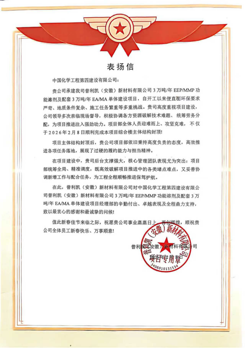 近日,由西部公司承建的普利凱(安徽)新材料有限公司3萬噸/年EEP/MMP功能溶劑及配套3萬噸/年EA/MA單體建設項目綜合樓主體結構順利封頂,標志著項目建設取得階段性勝利,正式轉入二次結構及裝飾裝修施工階段。業(yè)主單位特發(fā)來表揚信,對項目團隊的卓越表現給予高度評價。
